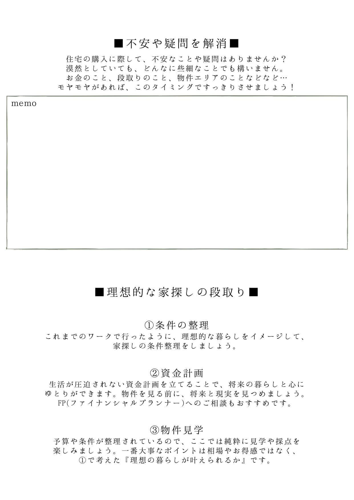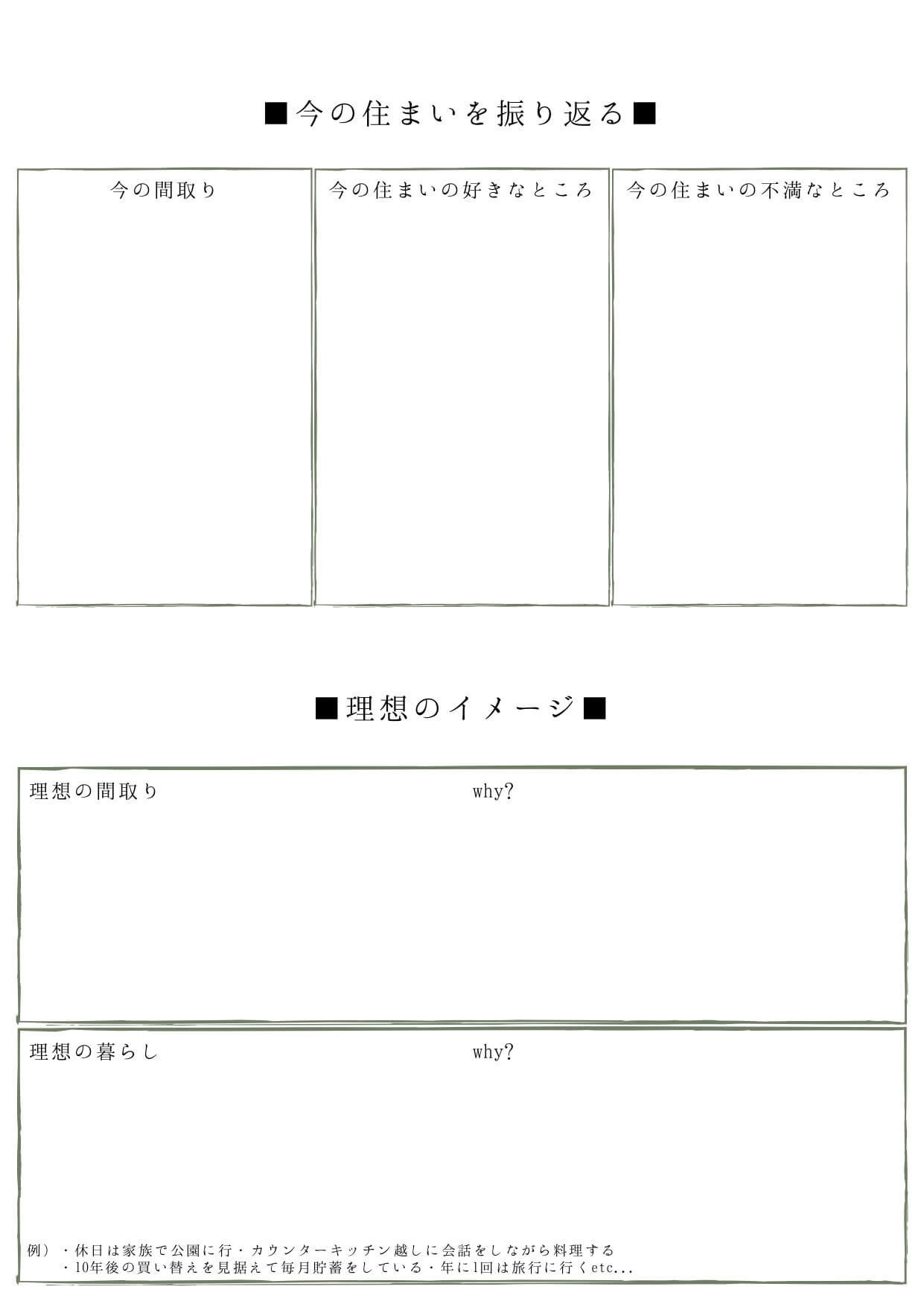 自分たちが今何を望んでいるのかもわからない状態だったので、カルテを記入しながら、希望を具体的にしていきました。「なぜ家を購入したいのか」「どんな暮らしをしたいのか」カルテを書くことで、物件探しで迷子になることもなかったです。
